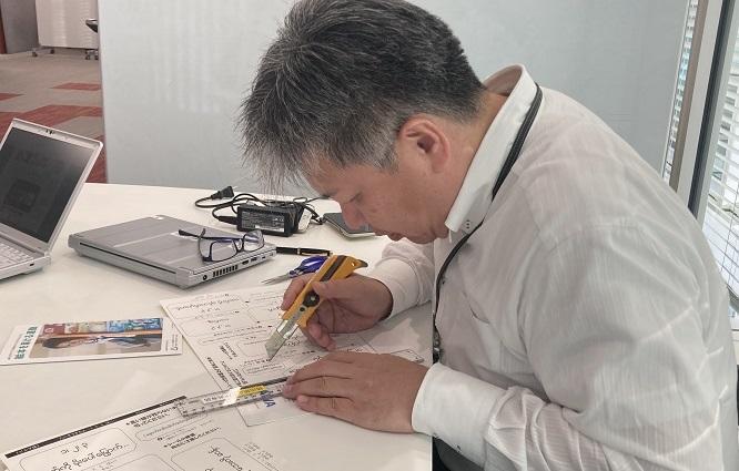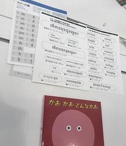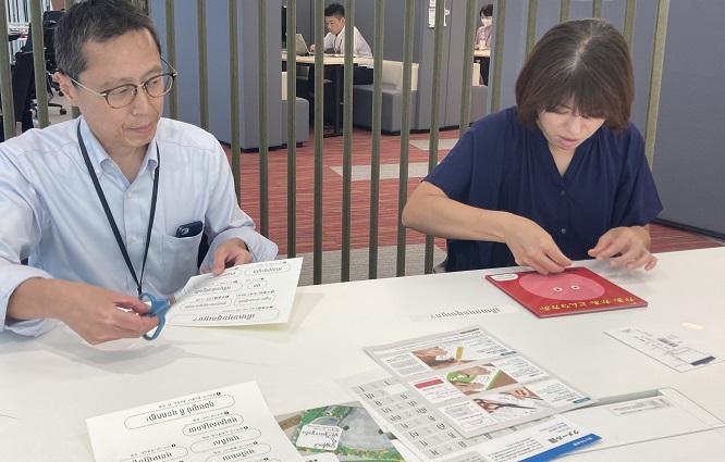 お互いに自分が不器用であることを自慢しあった後(笑)、シールを切る人、シールを貼る人に分かれ、説明書の指示通りに、日本語の文字の上にミャンマー語やクメール語の文字シールを貼っていくと、あっという間(ではなく、1時間ほどかかりましたが・・)に翻訳絵本ができあがりました。
