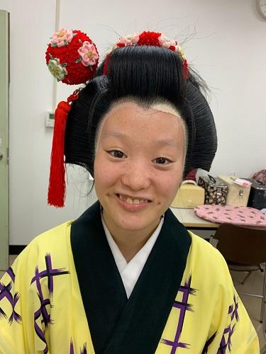 江戸時代の内容で舞台衣装は着物です。着物とマスクは練習の時から着用し、少し大変でした。かつらは本番の少し前から慣れるために付けましたが、とても重かったです。