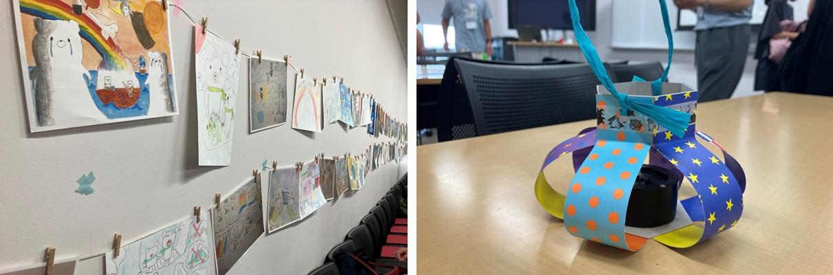 「学びのフェス2025夏」に出展した「そらべあ基金」の「ソーラーLEDちょうちんづくり」で、会場設営と資材準備を担当しました。兄弟ホッキョクグマ「そら」と「べあ」の物語から、地球温暖化について学んだ子どもたちの絵を会場に飾り付けました。自由で躍動感あふれる絵からは未来への希望が感じられ、スタッフとの会話も弾みました。