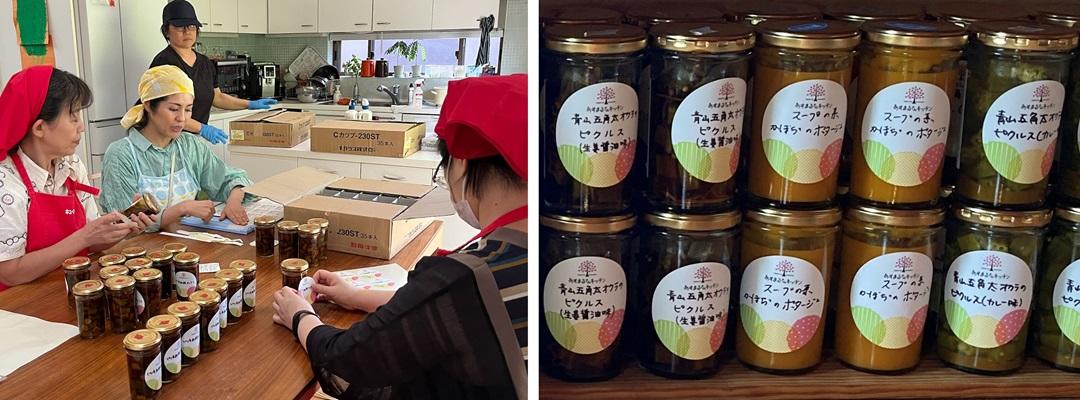 「あすまるさんキッチン」が行う「あすマルシェ」の商品準備では、規格外の農産品を活かした加工品を瓶に詰めたり、ラベルを貼ったりしました。食品表示ラベルには、こだわり野菜のユニークな品種名が記されていて、手書きの商品ラベルからは作り手の温かい心と愛情がひしひしと伝わってきました。