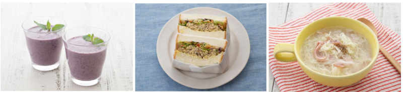 写真左から「緑黄色野菜とブルーベリーのスムージー」「サバカレーサンドイッチ」「千切りキャベツとベーコンの塩麹スープ」です。
