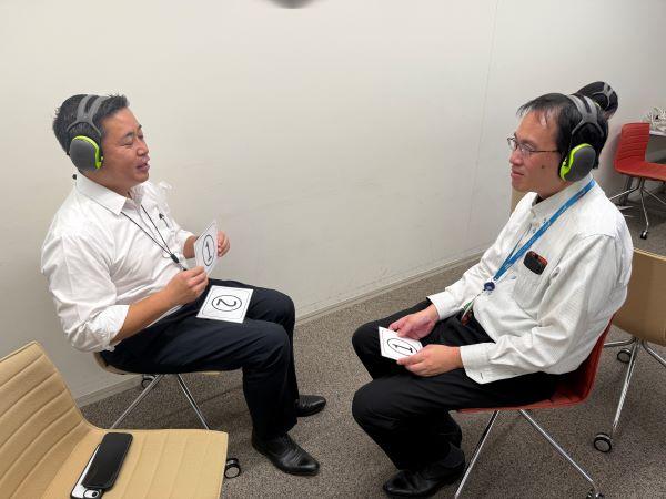 気心知れた同僚とのペアで、音を封じたコミュニケーションの難しさを体験(写真右が私、岡野)