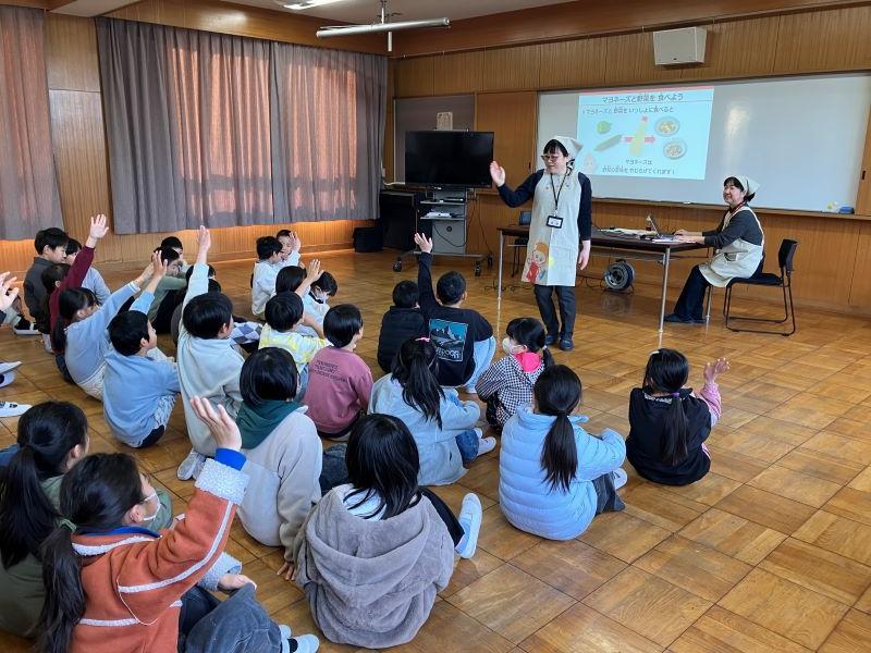 マヨネーズ教室は、まずは講義で「マヨネーズが何からできているのか」などを学び、続いて実習で実際に自分たちの手でマヨネーズを作る体験を行います。どの学校でも、 材料を混ぜ合わせる時の子どもたちのワクワクした表情、「固まってきた!」という驚きの声、手作りならではの味を確かめる真剣な眼差しに、教室中がおおいに盛り上がりました。参加した若手メンバーも、そんな子どもたちのキラキラした笑顔から、たくさんの元気をもらう貴重な機会となりました。