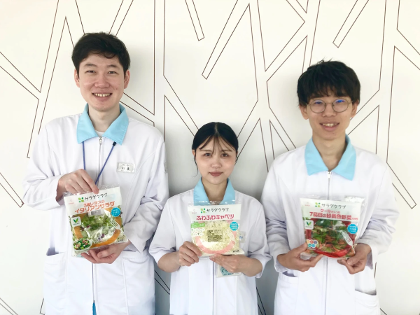 私たちの中に普段の業務で”野菜”を取り扱うメンバーはいないのですが、「若手の考えを活かして世の中に貢献したい!」「業務内容と異なることに挑戦したい!」という共通の想いのもと本プロジェクトがスタートしました。ではなぜ”野菜”なのか。きっかけは、メンバーの一人が学生時代に、袋入りのパッケージサラダにドレッシングを入れて振って食べていた体験です。その「おいしさと簡便さ」を形にしたいと考え、研究員の「やってみたい!」を応援する社内企画「わくわく開発提案会」に提案しました。実はこの「フリフリサラダ」という名前も、親しみやすさを考えてメンバーで試行錯誤して決めた自信作です。シャカシャカサラダやフレフレサラダなど案がいろいろあるなかで、議論を重ねて「フリフリサラダ」という名前にたどり着きました。
