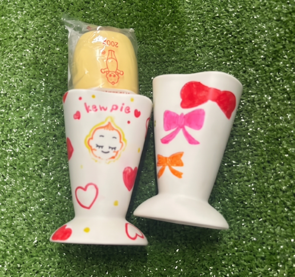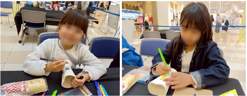 キユーピーのワークショップでは、真っ白な陶器製のマヨネーズスタンドをキャンバスに見立てて、子どもたちに自由にデコレーションをしてもらいます。電車を描いたり、お花を並べたり、シールを貼ったり、かわいいキユーピー人形を描いてくれる子も。何を描こうか迷う表情、ペンを握る真剣な手つき、そして完成したスタンドを満足げに眺める誇らしげな顔…。どの瞬間も本当に愛おしくて、見ているだけで温かい気持ちに包まれました。