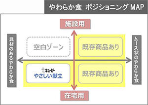 介護施設向けの商品は現状、ムース状のやわらか食が主流で、そのほとんどが調理が必要な「素材」です。一方、在宅向けには、ムース状のやわらか食のほか、「キユーピー やさしい献立」に代表される、具材感のある調理済みのやわらか食があります。今回発売する「冷凍やわらかおかず」は、これまで手薄だった市場に向けた商品と言えます。