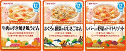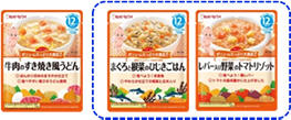 “ボリュームたっぷり大満足”がコンセプトの3品は、既存アイテムに比べて1.5倍の容量となる120g入りです。米やうどんなどの主食に、肉や魚、野菜を加えたバランスの良いメニューを揃えました。月齢12ヵ月頃からの、食べ盛りの赤ちゃんに向けた商品です。