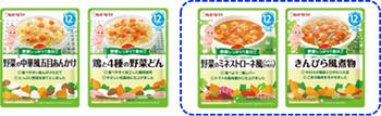 “野菜しっかり1食分”がコンセプトの4品は、赤ちゃんの食事に野菜を積極的に取り入れたいというニーズにこたえて開発した商品です。家庭でやわらかく調理するのが難しい、にんじんやごぼうなどの根菜類を多く取り入れているのが特徴です。また、味覚形成のサポートにも役立てたいとの思いから、和・洋・中のメニューを揃えました。