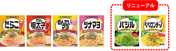 「炙りたらこ」の発売に合わせて“ペースト”タイプ2品をリニューアルします。「バジル」はソースに使用するバジル原料の塩味を抑えることで、従来品よりバジルの風味をアップさせました。また、「ペペロンチーノ」はローストしたガーリックの香ばしさをアップさせています。いずれも素材の風味や香りをより楽しめるようにしました。