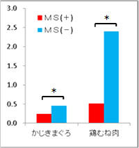 ひと口大のそぎ切りにした鶏むね肉をボウルに入れて、マヨネーズを加えて10分間漬け込んだのち、油をひいたフライパンで焼いた群をサンプル【MS(+)】とした。マヨネーズを加えない群【MS(-)】は、マヨネーズに含まれるのと同量の食塩を加え、漬け込みをした。