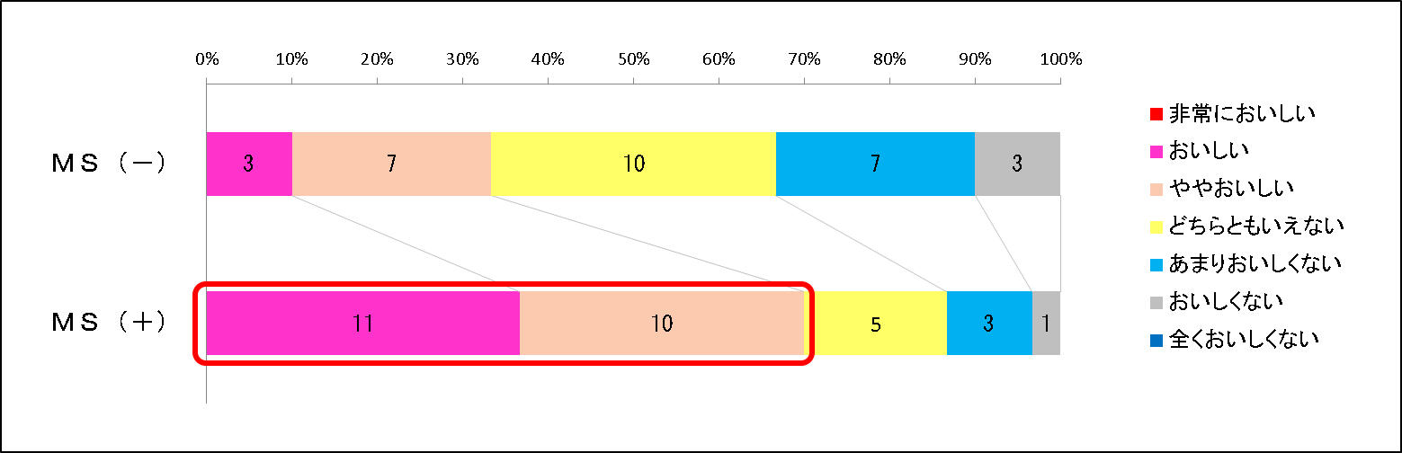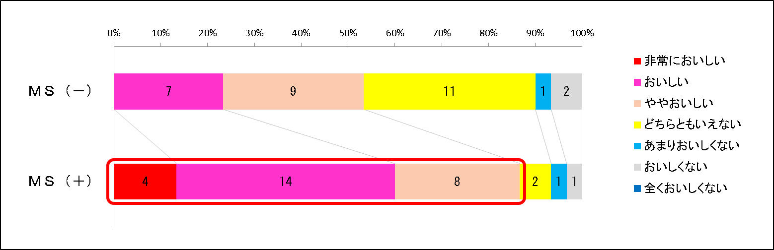| 検定方法 | 臭いの強度評価を0~6点(ない→非常に強い)、 おいしさの評価を1~7点(非常においしくない→非常においしい)とし、 その点数の平均値の差を、対象のあるt検定で検定した。 |