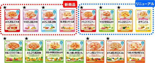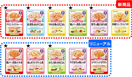 赤ちゃんは月齢が上がると、食事回数が増え、栄養の大半を食事から摂取するようになります。その分、調理に時間がかかる、献立を考えなければいけない、など離乳食を手作りする負担は大きくなります。今回、月齢9ヵ月頃から12ヵ月頃に向けたラインアップを中心に、鶏レバーやまぐろなど、家庭ではあまり使わない素材を使ったメニューや、手の込んだ作りにくいメニューを充実させました。
