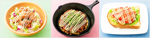 「3つ穴キャップ」とは、キャップを開けると3本の線描き、キャップを外すと星型の絞り口を使える新開発のキャップです。従来のダブルキャップ※の、細口・星型の2通りに絞り出せる機能はそのままに、細口の穴を3つにし、径を小さくすることで、線描きの楽しさをさらに向上させました(写真左下)。サラダのほか、お好み焼きやパン、丼などにまんべんなく線描きすることで、料理を見映えよく演出できます。