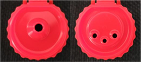 (左)従来の1つ穴の細口、(右)3つ穴キャップ