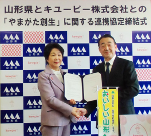 キユーピーは、2月12日(火)、山形県(県知事:吉村 美栄子)との間で、地域の活性化と県民の生活の質の向上を目的とした地方創生の推進に関する包括連携協定を締結しました。協定期間は2019年2月12日から1年間です。キユーピーと山形県の双方が持つ資源を有効に活用して協働することにより、「やまがた創生」に資することを目的としています。