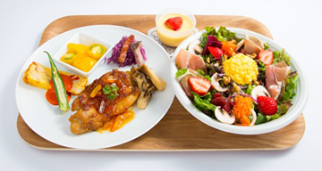 キユーピーがこれまでに提案してきたさまざまなメニューが詰まった特製ランチプレートです。10種類以上の野菜と卵を使ったカラフルなサラダ(3種類から選択)に、野菜と卵の前菜、マヨネーズやドレッシング、ジャムを使ったメインディッシュ(2種類から選択)を合わせたプレートです。コクと甘み、すっきりした後味が特徴のこだわりの卵「エグロワイヤル」を使い、さらにプリン液にマヨネーズを加えてしっとりなめらかに仕上げたマヨプリンが付きます。選べるサラダは「パワーサラダ」、「シーザーサラダ」、「コブサラダ」(下記参照)の3種類です。