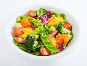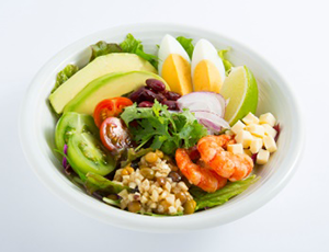 7種類の葉物野菜、アボカドや2色のトマトに、ゆで卵とえびを合わせました。黒酢たまねぎドレッシングで味付けしたキャベツライスも加え、食べ応えのある一皿に仕上げました。