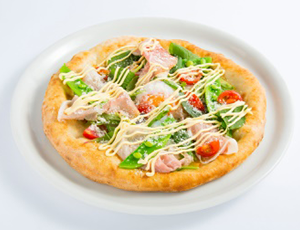 九州産のベビーリーフやスナップエンドウ、ミニトマトと生ハムをのせたサラダピッツァです。半熟卵をのせ、マヨネーズを線描きして仕上げました。(6月17日~6月23日に提供)