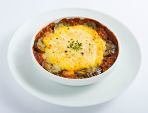 キャベツライスに、ミートソース、豆や雑穀を混ぜ合わせて、なすと卵、チーズをのせて焼き上げました。