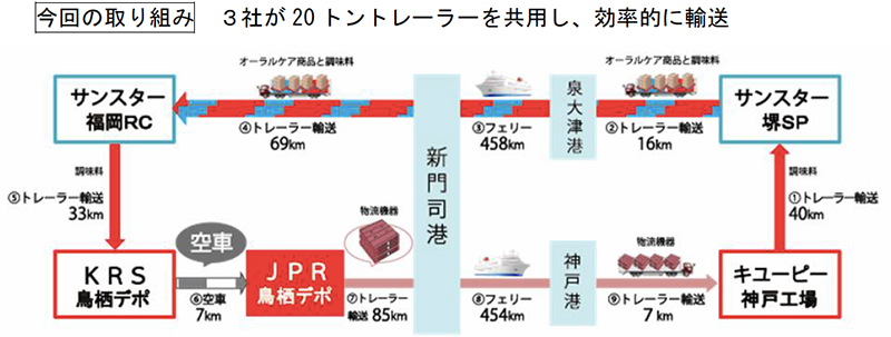 共同輸送を実施するのは、関西と九州をつなぐ輸送ルートです(キユーピーおよびサンスターが関西から九州へ、JPRが九州から関西へのルート)。この一部を船舶に置き換え、往路はキユーピーとサンスターの荷物を混載し、復路はJPRの輸送用レンタルパレットを積載することで、輸送効率を高めます。混載の対象商品は、マヨネーズやドレッシングなどの調味料とハミガキやハブラシなどのオーラルケア製品です。