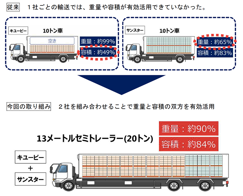 キユーピーとサンスターの商品をうまく組み合わせ、13メートルセミトレーラー(20トン)を満載にする