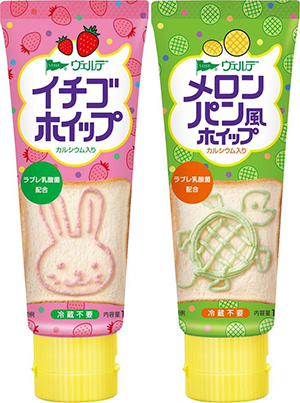 「ヴェルデ ホイップ」シリーズは、1997年にチューブ容器入りホイップとして発売を開始し、軽い口どけと容器の使いやすさから、小さな子どもがいるファミリー層を中心に高い支持を得ています。そこで今回、子どもに人気の「イチゴ」と「メロンパン風」をラインアップに加え、シリーズを強化します。またカラフルな色合いでお絵かきやデコレーションがより楽しめます。