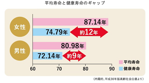 超高齢社会において、平均寿命と健康寿命の間には約10年のギャップがあり、これを埋めるためには、生活習慣病の予防が大切です。キユーピーグループは、健康意識の向上や野菜摂取量の増加につながる商品を開発することで、健康寿命の延伸に貢献していきます。