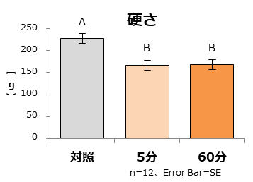「すりおろしオニオンドレッシング」に漬け込むことで、対照に比べ有意に「硬さ」が低減しやわらかくなった。漬け込み時間による差は無かった。