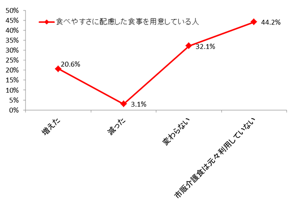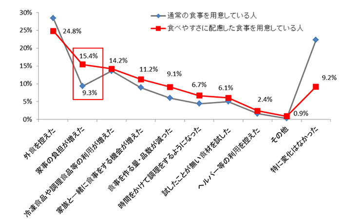 「家事の負担が増えた」と回答した人は、通常の食事を用意している人が9.3%であるのに対して、食べやすさに配慮した食事を用意している人は15.4%で、6.1ポイント高くなっています(グラフ3)。