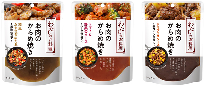 「わたしのお料理TM」ブランドサイトで新たに紹介する商品は、3月1日(月)に新発売する「和風たまねぎのたれ~黒酢仕立て~」、「トマトと野菜のソース~ハーブ仕立て~」、「ドミグラスソース~赤ワイン仕立て~」の3品です。