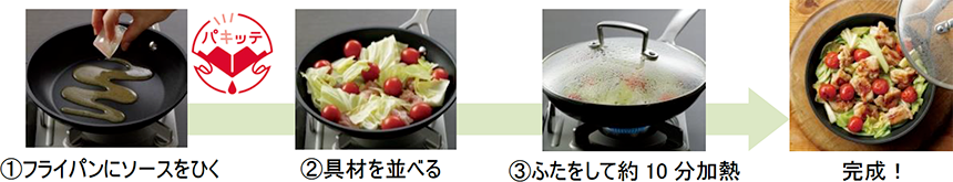 「蒸し煮用ソース」は、フライパンで10分蒸すだけで簡単に野菜たっぷりのおかずが作れる調理ソースです。素材の味を生かすシンプルな味付けで、いろいろな食材の組み合わせが楽しめます。