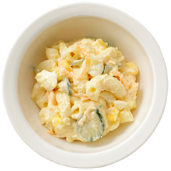 ポテトマカロニサラダに、ゆで卵、きゅうり、コーン、にんじんを加え、彩り豊かに仕上げました。