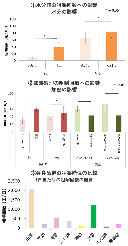食品ごとに噛む回数をランク付け、60品目を追加水分量・加熱が咀嚼回数に与える影響なども検証