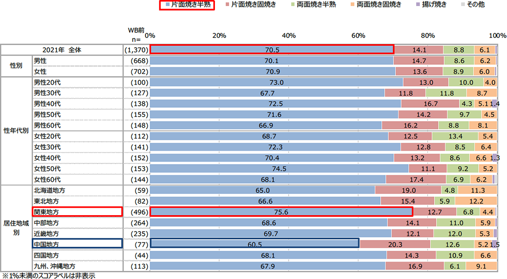 居住地域別にみると、関東地方では「片面焼き半熟」が全体に比べ高く、中国地方が逆に低い傾向であることが分かりました(資料3)。