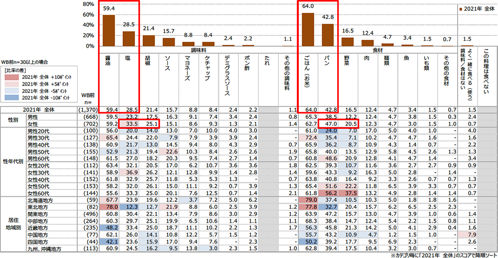 性別で見ると、女性は男性に比べ「塩」「胡椒」「パン」「野菜」と一緒に目玉焼きを食べる人が多いことが分かりました(資料4)。