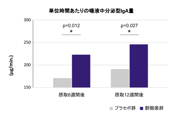 今回のヒト臨床試験では、酢酸菌の摂取が免疫機能や体調維持に及ぼす影響について検討するため、20~64歳の健常成人で、風邪にかかりやすい人(事前アンケートによる)95名を2グループに分けました。一方のグループは1日あたり酢酸菌GK-1を150億個含む食品を12週間摂取してもらい(酢酸菌群)、もう一方のグループは酢酸菌を含まない食品を同様に摂取してもらいました(プラセボ群)。摂取から6週間後、12週間後にそれぞれ、唾液中の分泌型IgA量を測定した結果、酢酸菌群ではプラセボ群よりも唾液中の分泌型IgA量が多いことが分かりました(グラフ1)。