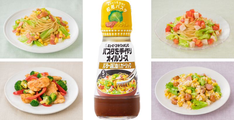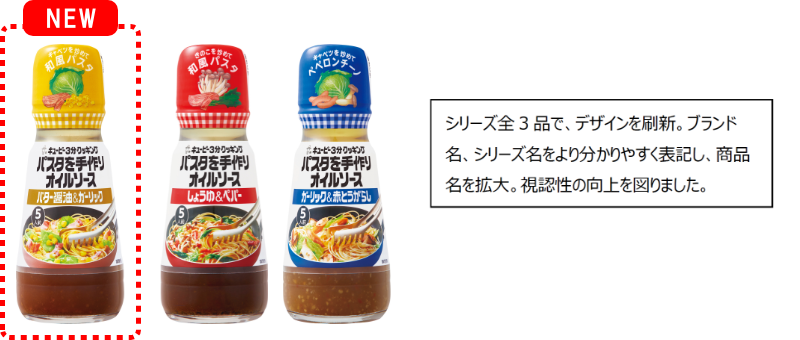 キユーピー3分クッキング パスタを手作りオイルソースシリーズから「バター醤油&ガーリック」を新発売 シリーズ全3品でパッケージを刷新