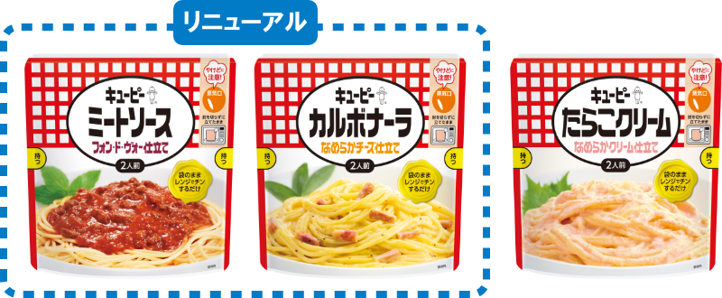 キユーピー株式会社(本社:東京都渋谷区、代表取締役 社長執行役員:長南 収、以下キユーピー)は、封を切らずに立てたまま電子レンジ(500W)で70秒温めるだけのスタンディングパウチ入りパスタソース※のうち、「ミートソース フォン・ド・ヴォー仕立て」と「カルボナーラ なめらかチーズ仕立て」の2品をリニューアルします。ミートソースは、肉のうま味と野菜本来の甘み・コク、後味のキレを向上させ、さらなる満足度の向上を図ります。カルボナーラは、チーズのうま味・コク、クリーム感を向上させ、より濃厚な味わいを楽しめるよう改良を行います。