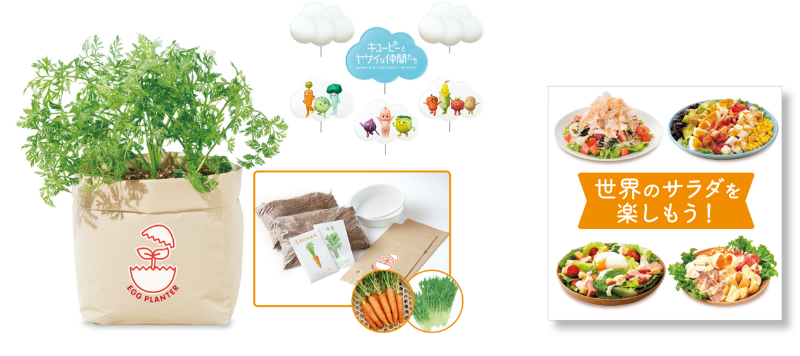 賞品の「収穫体験キット」は、家庭で野菜の栽培が体験できるキットです。オリジナルデザインのフィルムプランター、ガーデンピック、受け皿、培養土6L、野菜2品種(ミニにんじん、水菜)の種子がセットになり、すぐに栽培を始められます。フィルムプランターは卵殻を51%配合し、ガーデンピックと受け皿、さらに「レシピブック」の用紙の一部にも卵殻を使用しています。キユーピーは、1950年代からマヨネーズなどの製造過程で発生する卵殻の再生利用の取り組みを始め、現在では100%再資源化に成功しています※1。今回、収穫体験キットの一部に卵殻を使用※2することで、資源の有効活用と循環型社会実現への貢献を目指しています。また「家族と楽しく資源の有効活用について会話しながら、自ら野菜を育てる体験を通して、子どもが野菜を好きになる」そんな食育体験を届けたいという思いで企画しました。