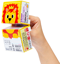 - 外箱をミシン目に沿って開くと「トレー」として使えます。主食とおかず、2つのカップを片手で持つことができて便利です。カップを取り出すと、外箱に描かれた動物のイラストをパペットのように使うことができ、赤ちゃんのかむ練習を促すのにも役立ちます。