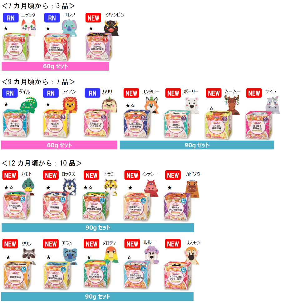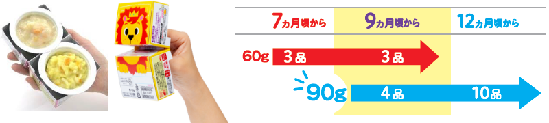 本シリーズはこれまで、月齢7カ月から12カ月頃を対象に60g×2個セットで商品を展開してきました。「赤ちゃんの成長に合わせて容量を増やしてほしい」という要望が多かったことから、今回、月齢9カ月頃と12カ月頃の高月齢向けに新たに90g×2個セット14品を発売します。月齢9カ月頃は60gと90g、2つの容量展開で、成長に合わせて選択できます。