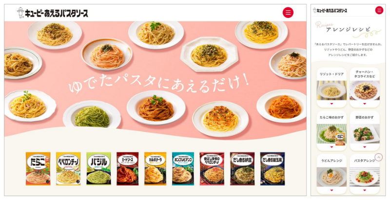 新しい「あえるパスタソース」の特設サイト:㊧TOPページ、㊨アレンジレシピ(スマートフォン版)
