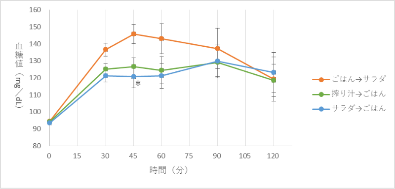 摂取開始時を0分として、摂取30、45、60、90、120分後に採血を行い、血糖値、血清インスリン、血清トリグリセリドの濃度をそれぞれ測定しました。その結果、②野菜サラダ→ごはんの順に食べた群が、①ごはん→野菜サラダの群と比較して45分後に血糖値が有意に低い値を示しました。つまり、②野菜サラダ→ごはん、の順で摂取すると食後の急激な血糖値の上昇を抑えられることが確認できました(グラフ1参照)。なお、血清インスリン濃度・血清トリグリセリド濃度については、3種類の食事間に有意差は認められませんでした。