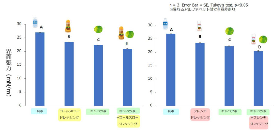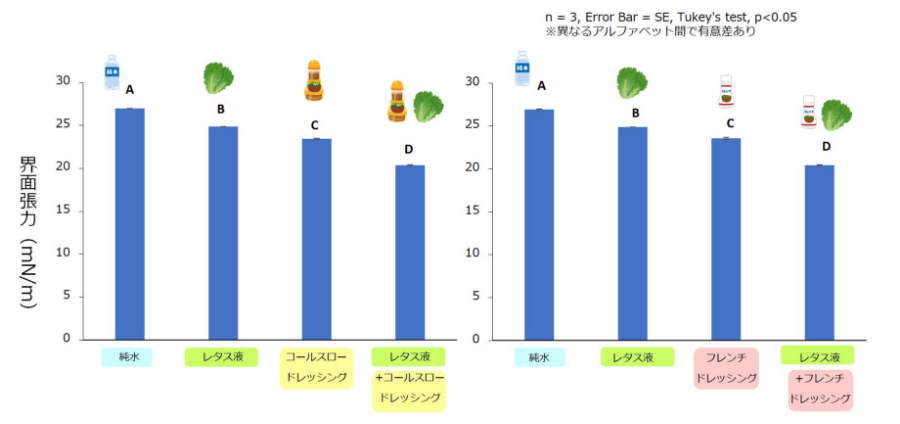 純水に比べ、大豆油に対するキャベツ液・レタス液の界面張力は、すべて有意に低下しました。そこへ、ドレッシングを添加すると、より効果が大きくなることが分かりました(グラフ2、3参照)。