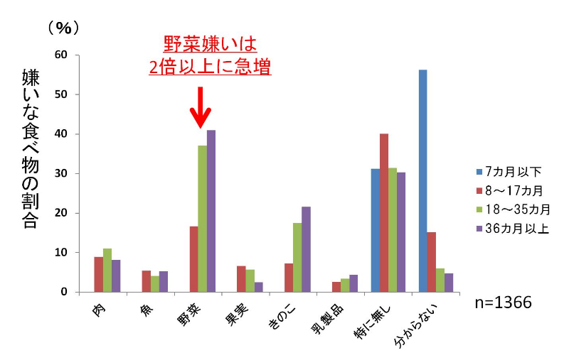 グラフ4 嫌いな食べ物と月齢(野菜嫌いは18~35カ月で2倍以上に急増する)