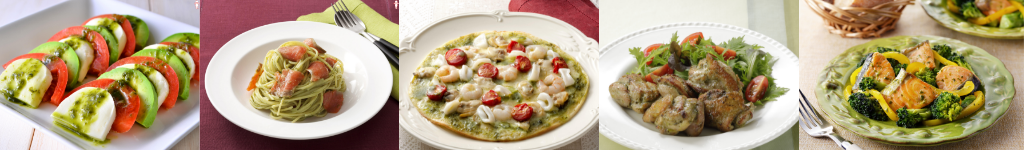 ㊧から、「トマトとアボカドのカプレーゼ」、「スモークサーモンのバジルクリームパスタ」、「シーフードバジルピザ」、「バジルチキン」、「鮭とブロッコリーのバジル炒め」