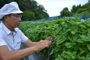 「Italiante バジルソース」に使用するバジルは国産にこだわり、2節目以上の柔らかい新芽だけを使用しています(写真)。国内の契約農家が栽培するバジル畑から、50km圏内の工場で速やかにペースト状に加工したものが、「Italiante バジルソース」の原料となります。バジルの爽やかな風味と鮮やかな色合いは、国産バジルを丁寧に加工することで生まれるのです。