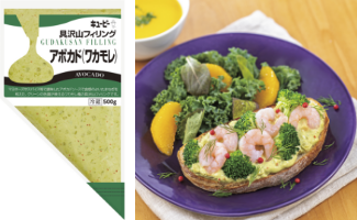 生のアボカドは、カット後に褐変しやすく、オペレーション面での扱いづらさが課題でした。新商品の「キユーピー 具沢山フィリング アボカド(ワカモレ)」は、きれいなグリーンの色調がメニューに映える、褐変しにくいアボカドのフィリングです。フィリングとしてそのまま使うのはもちろん、焼成メニューにも使用できるため、メニューの幅が広がります。