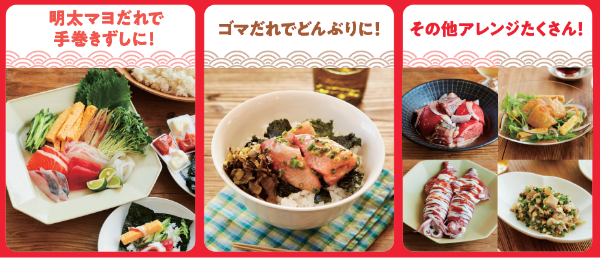 「うま辛明太マヨ味」は刺身単体より、ぜひ、手巻き寿司のソースに使ってみてください。海苔とご飯にぴったりです。「焙煎ねりゴマ味」は、鯛の刺身にからめて、ご飯にのせ、上から出汁をかけると“鯛茶漬け”になります。また、鯵の刺身とネギやミョウガとあえると“なめろう”になります。