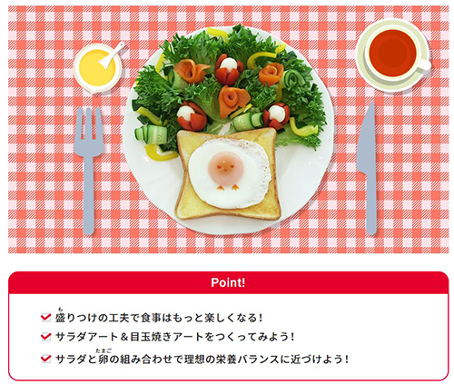 新たに公開した「サラダと目玉焼きで作る『食べるアート』で食事を楽しもう!」では、野菜や卵などの盛り付けの工夫で『食べるアート』を作り、目で楽しむことで、会話の弾む食卓を目指しています。